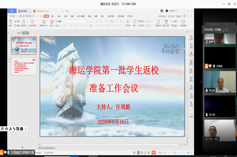 廖勇老师向全体员工传达《点点taptap关于2020年春季学期第一批员工返校的通知》,针对员工返校前、返校中、返校后,结合海运公司防疫领导工作小组工作部署,与大家解读了具体实施方案。