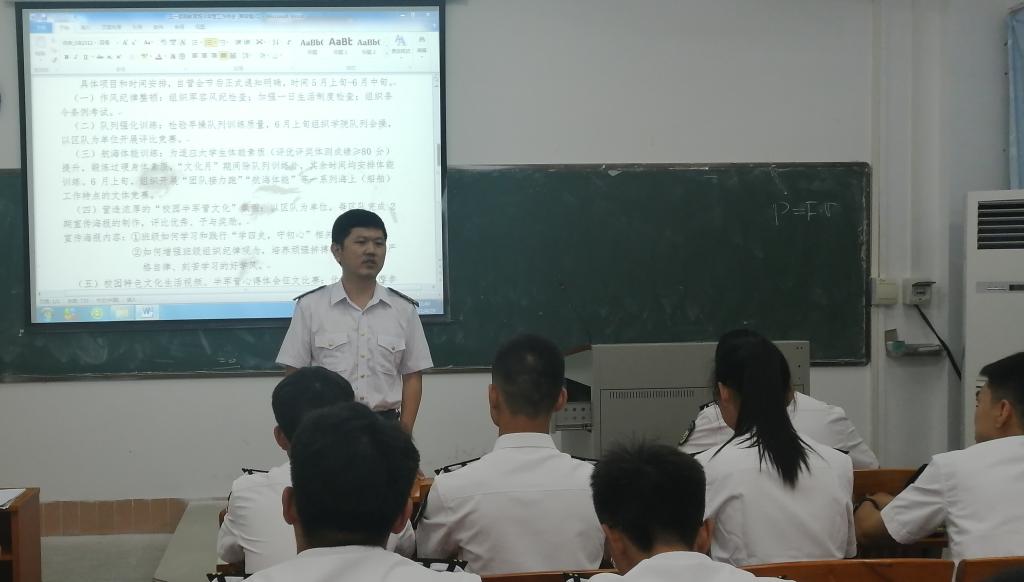 首先,刘抒睿讲评4月份各中队的半军事化管理情况;布置公司将在5月份举行的“半军管文化月”工作安排。目的通过组织作风纪律整顿、军容风纪检查、条令条例考试等,进一步增强同学们的组织纪律观念。强化队列、体能等训练,锻炼同学们过硬的身体素质。开展的“半军管”特色文体活动,航海技能比赛、征文比赛、校园生活(视频、板报)展映等营造浓厚的半军事化管理氛围,使半军事化管理育人目标和理念,深深扎根每一名新同学心中。随后,江涛教育各位员工干部,要提高自身工作标准、团结同学、积极发挥好模范带头作用,严格落实半军事化管理制度,努力把每一个区队都建设成为优秀的班集体。
