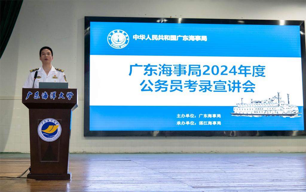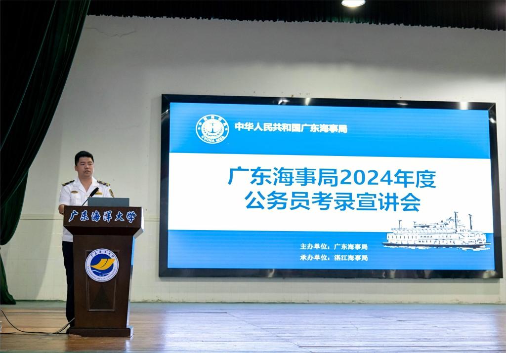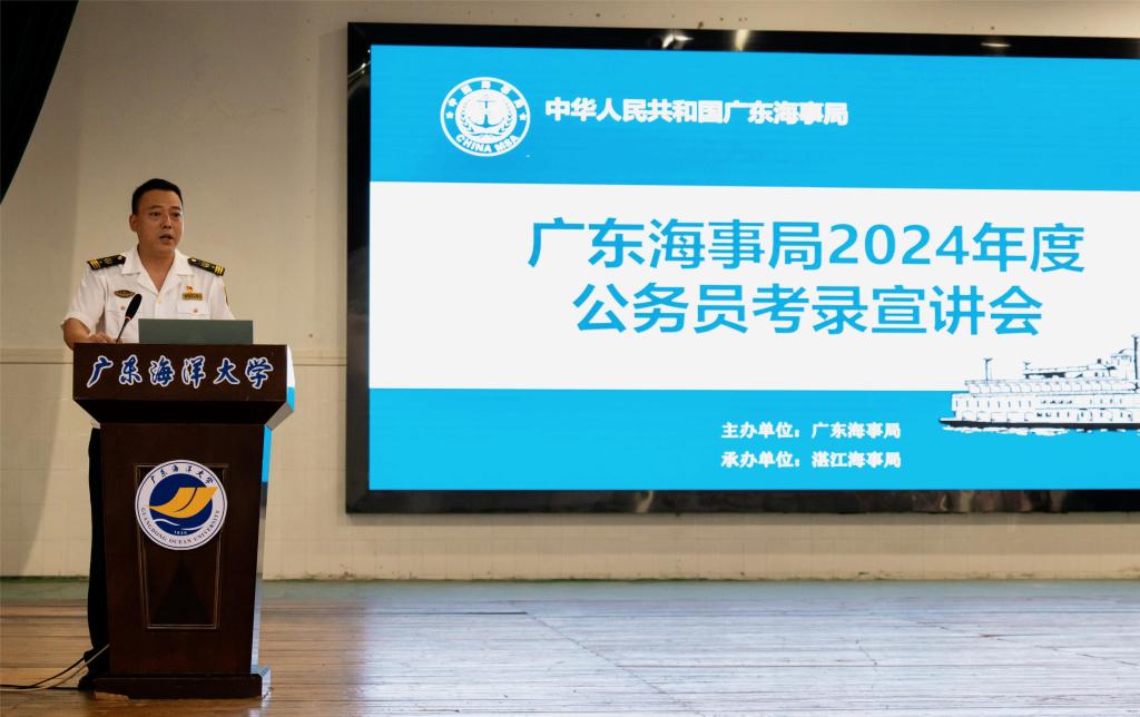 随后,与会人员集中观看了广东海事局宣传片,全方位了解了广东海事局履行水上交通安全监督管理、船舶及相关水上设施检验和登记、防治船舶污染和航海保障等行政管理和执法职责的有关情况。宣讲员详细介绍了2024年度公务员招录招聘计划,职位和岗位设置、专业需求、工作职责等情况。在广东海事系统工作的优秀员工邓平贵、蔡俊杨分享了海事工作的经验体会。