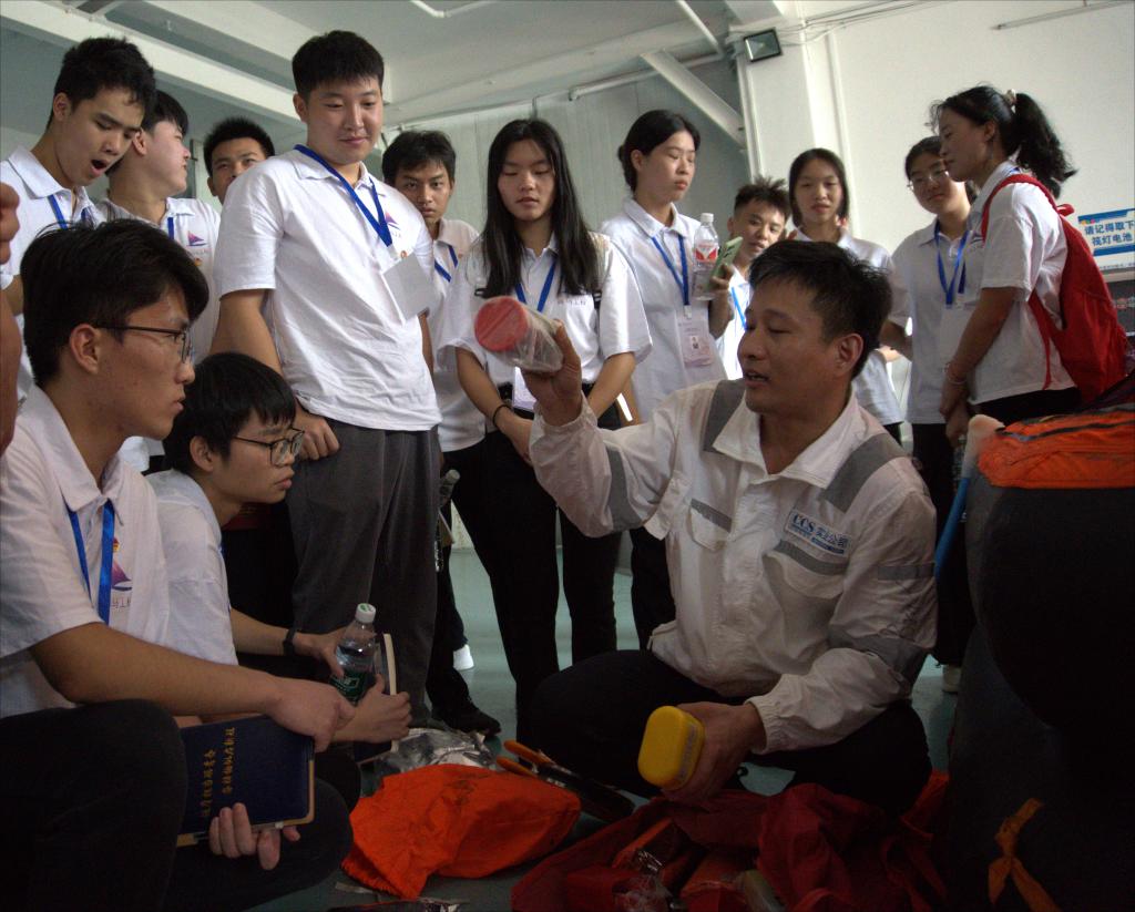 首先,高楷博带领同学们实地参观并详细介绍了救生筏、海上撤离系统、消防设备和固定灭火系统等,为同学们上了一节生动的专业课。