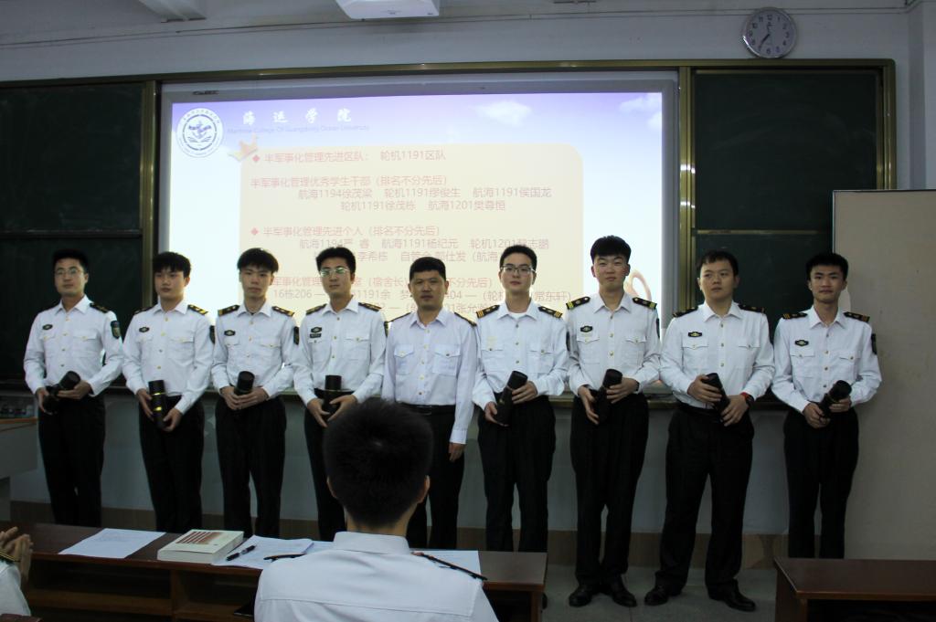 2022418海运公司本学期半军管工作会议在实验楼306召开。参加本次会议的有公司党委副书记齐昊、副大队长江涛辅导员郑,自管会(国旗班)和专业中队部分员工干部等,会议由大队长刘抒睿主持。