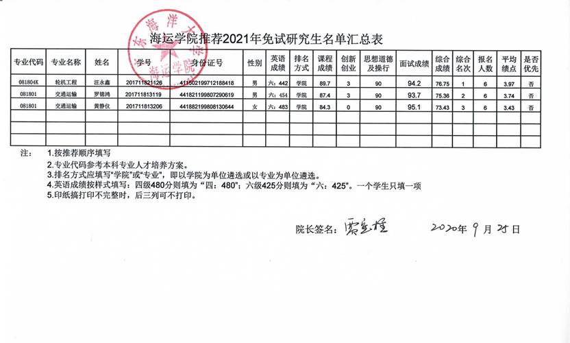 附件:海运公司推荐2021年免试研究生名单汇总表