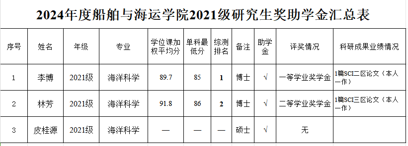 根据《广东省教育厅关于做好2024年秋季学期员工资助工作的通知》及《公司关于开展2024年研究生国家奖学金、学业奖学金和助学金评审工作的通知》精神,按照《点点taptap全日制研究生奖助学金实施办法》,经个人申请、公司评审小组认真审核及严格评选,拟确定获得研究生助学金、学业奖学金人员名单。其中,2021级海洋科学专业皮桂源同学因休学补发半年助学金,其余硕士研究生均不分等级全部获得助学金。现将评审名单进行公示(详见附表)。