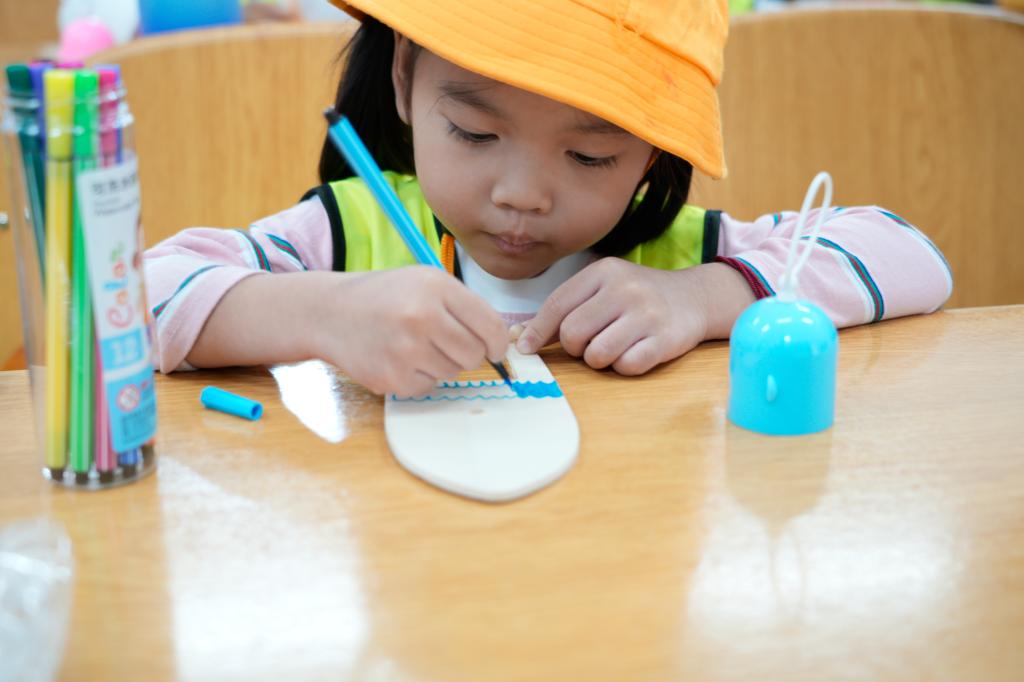 体验结束后,小朋友们迎来了一个充满创意与想象的绘画活动。他们每人领取了一艘空白的船模和彩色画笔。志愿者们鼓励小朋友们根据自己刚刚在模拟驾驶舱中的体验,以及在宣讲室学到的航海知识,画出自己心中理想的船舶。