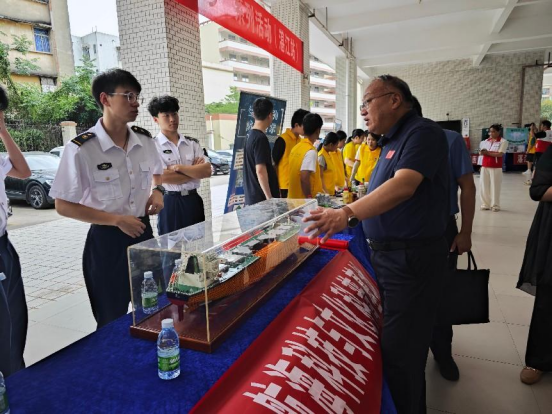 开幕式精彩节目表演结束后,湛江市第十七中学员工有序来到船舶模型展台前参观。根据我们所展示的船舶模型,为员工们进行了细致入微地讲解。近在咫尺的船舶模型与生动的讲解,激发了员工们对航海世界的强烈好奇心与探索欲。参观结束后,志愿者向员工们发放基地宣传单。