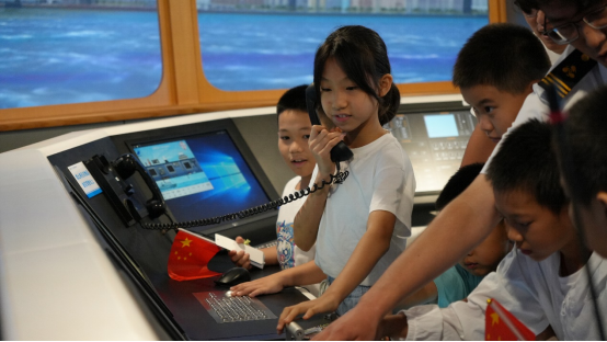 活动的最后一站是航海模拟器的体验环节。小朋友们兴奋不已,纷纷化身小小船长,坐在模拟驾驶舱里,紧握操纵杆,仿佛真的驾驶着巨轮在波涛汹涌的大海中乘风破浪。他们时而专注地观察着屏幕上的海况,时而果断地调整航向,脸上洋溢着自信和喜悦。在这个充满趣味的体验中,一颗航海的种子在小朋友们心中深深扎根,相信未来一定会收获满满的希望与成就。